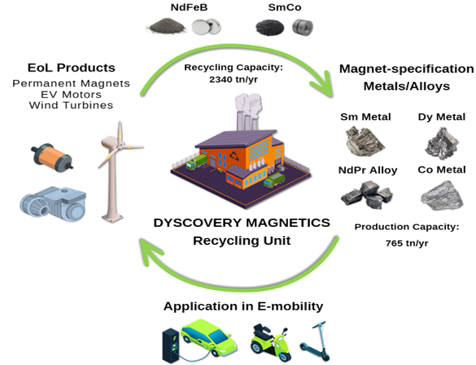 DYSCOVERY MAGNETICS develops and deploys an industrial recycling platform that converts end-of-life permanent magnets into high-value, magnet-grade materials. Our process directly produces rare earth metals and alloys suitable for re-entry into the European magnet value chain.